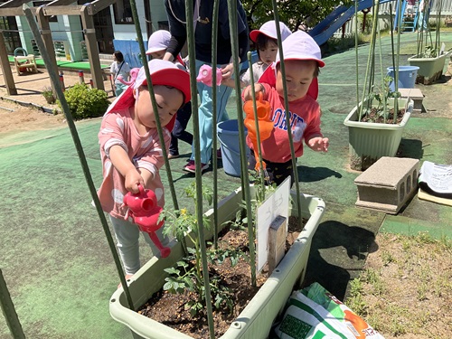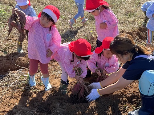 自分で配膳します(3歳児) いちごの収穫 芋ほり 夏野菜の収穫 野菜の水やり(2歳児) 大根引き おいしいたくあんになりますように(5歳児) 三色栄養教室 箸使いも上手になったかな 歯みがき クッキング(3~5歳児) もちつき会