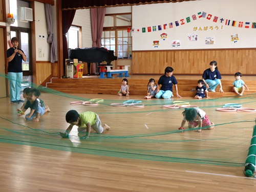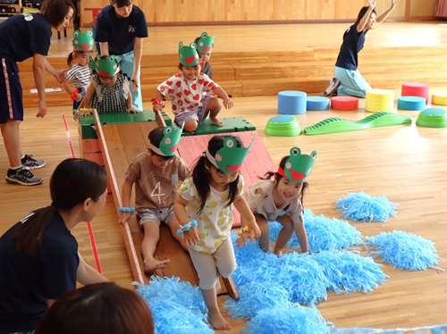 さかあがり ターンしながらスーイスイ(5歳児) とび箱 うんてい遠くまで行けるかな タイミングを合わせてジャンプ ネットくぐり上手でしょ(2歳児) 運動あそび(1歳児) 運動あそび(2歳児) 運動会(3~5歳児) たくさんとべたよ(5歳児) プール活動夏には、園庭のプールで水あそびやいろいろな泳ぎに挑戦します。
