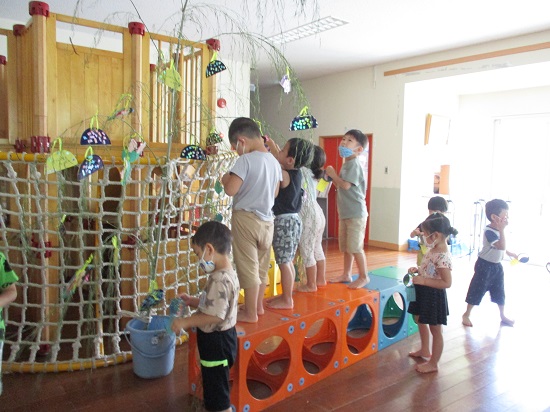 各クラスで工夫を凝らした飾りを笹につけ、会では七夕の由来を知ったりゲームをしたりしました。