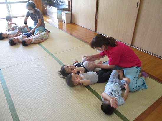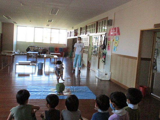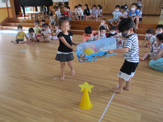 コロナ禍で盛大なおまつりは自粛ですが、保育者とおともだちと楽しくおまつりごっこをしました。