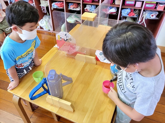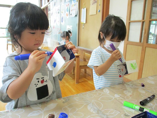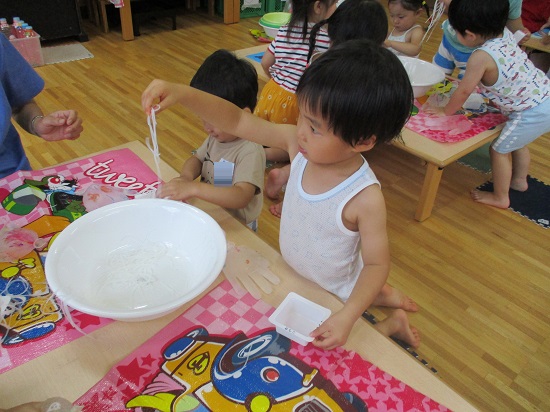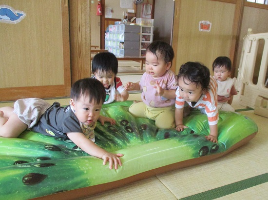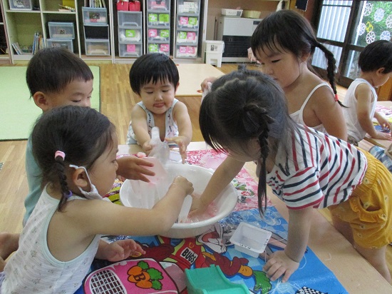 この夏、水風船や氷あそび等、グニャグニャや冷たい感触を楽しみました。