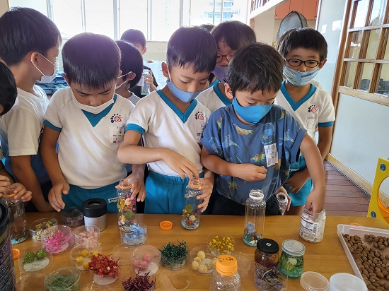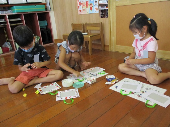 折り紙で本物そっくりな焼き芋を作ったゆり組。指スタンプでかわいいお花を作ったもも組。