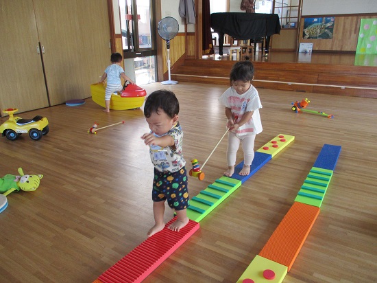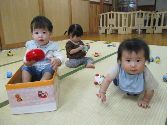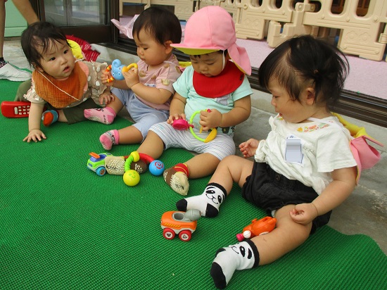 ぽかぽか太陽の下で仲よくおもちゃで遊んだり、園庭散策をしています。