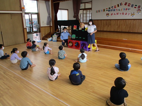 『3匹のこぶた』のパネルシアターで楽しく交通ルールを学びました。