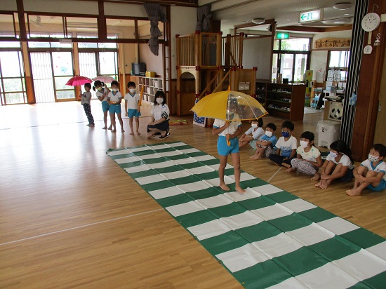 ふじ組は傘を使って横断練習。「上手だね!」とほめられました。