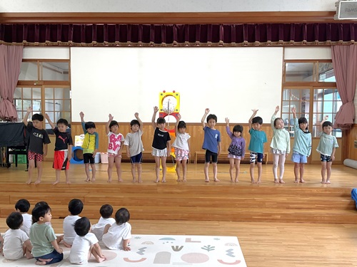 ふじ組がこれからの安全なプール活動を宣誓し、先生たちがバタ足などの泳ぎを披露。