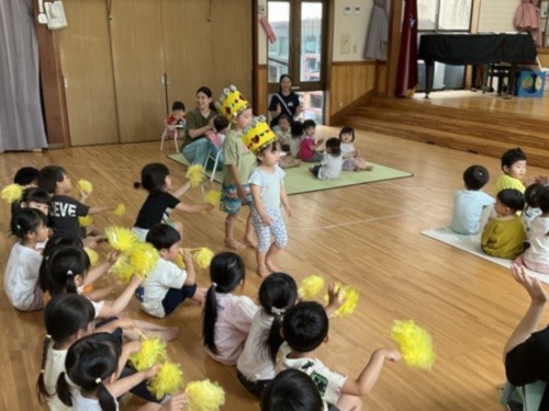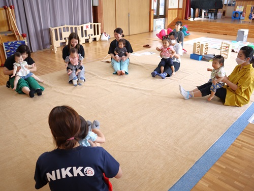 わらべうた遊び「おすわりやす いすどっせ」では軽快なリズムと動きに、みんなご機嫌!