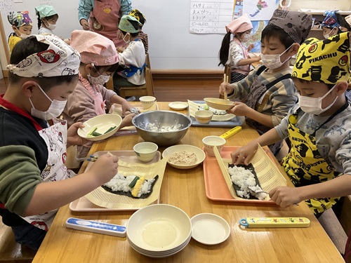 きく組はもちピザ、ゆり組はおにぎり、ふじ組は巻き寿司と、自分で作ることの