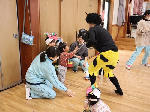 鬼の登場に固まっていた子も、負けずに「鬼は外ー!福は内ー!」