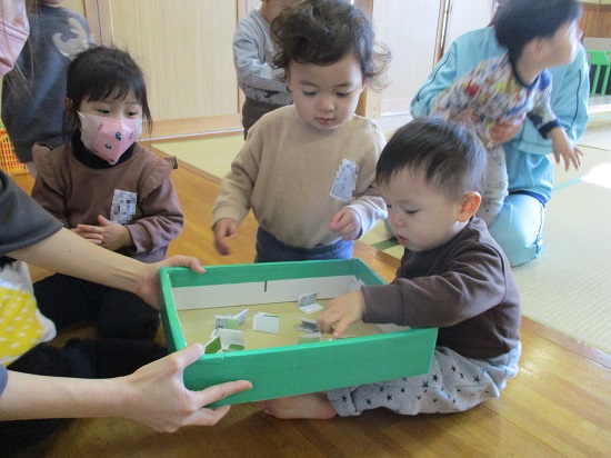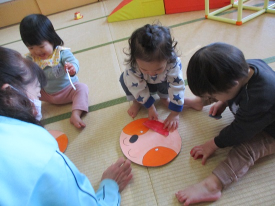 もも組は福笑いに挑戦。大好きなアンパンマンの顔ができてくると、指をさして喜んでいました。