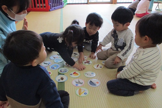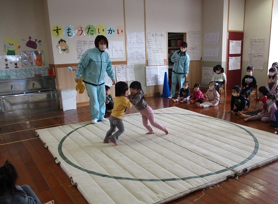 もも組はトントンずもう。ばら組以上はすもう大会とカルタ大会に参加し、真剣な様子にみんなの