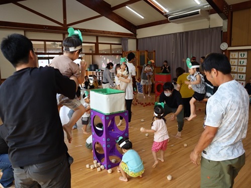 かえるの親子、力を合わせて玉入れ!たくさん入って嬉しかったね。