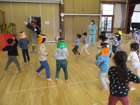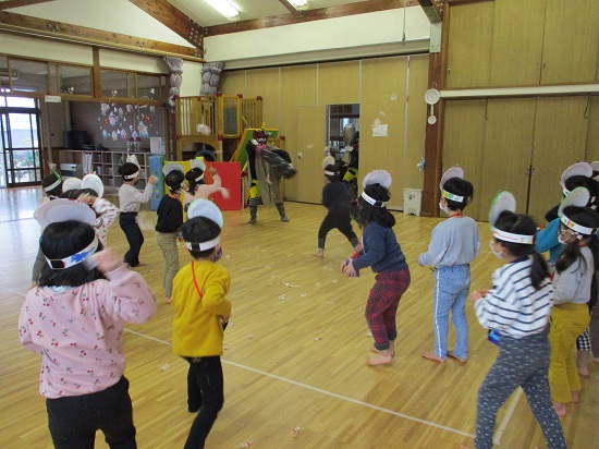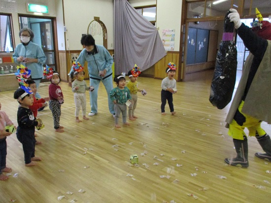 鬼の登場にビックリして固まる子、泣き出す子、いろいろでしたが「豆を投げるよ!」と