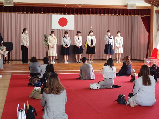 新しい仲間を迎えた入園式での職員紹介の場面です。