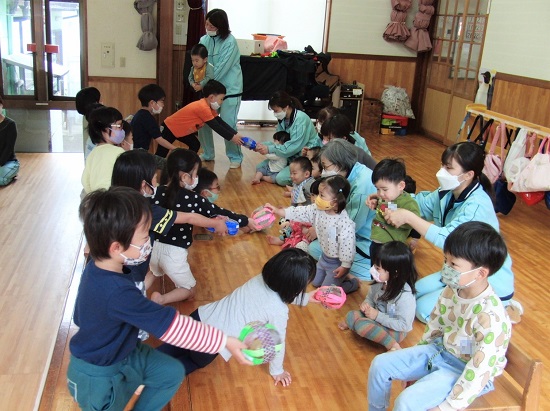 エプロンシアターやマジックショーで入園、進級のお祝いをしました。