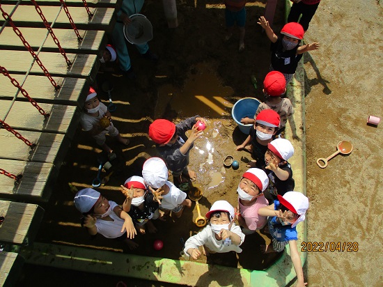 しゃぼん玉を屋根までとばしたり、砂場で泥あそびをしました。