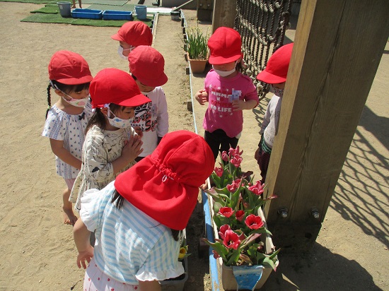 「わぁ~きれい!」と見事に咲いたチューリップに拍手をしていたきく組さん。