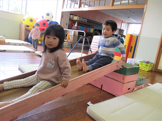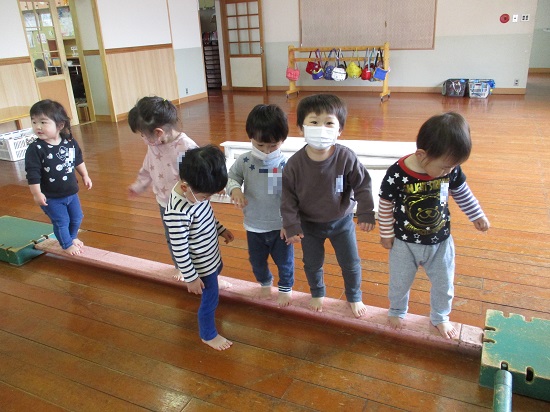 「そ~っと、そ~っと一本橋を渡るよー!」みんなで遊ぶと楽しいね。