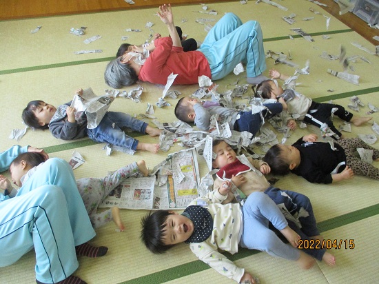 みんなでゴロン。新聞をちぎったり丸めたり、上から降ってくる新聞に大はしゃぎ!