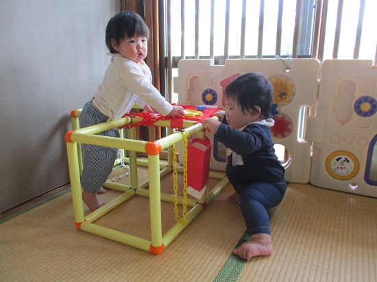 コロコロ鳴るボールに新しい友だちもにっこりと喜んでくれました。