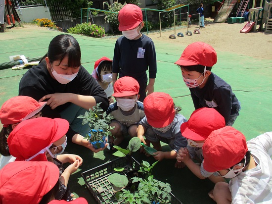 楽しみにしていた野菜の苗植え、「まるいはっぱとギザギザのはっぱだ!」とはっぱの形の違いに
