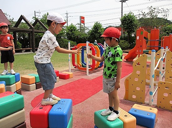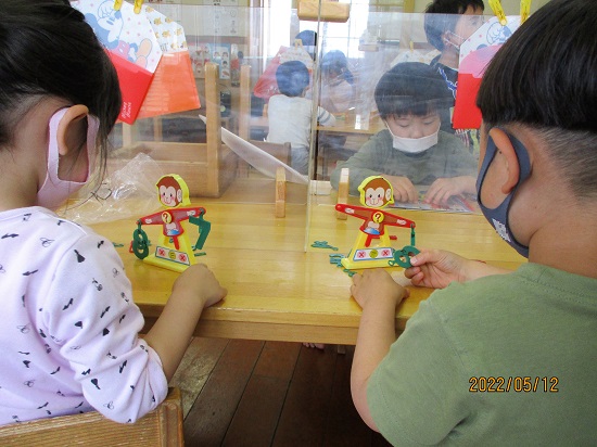 これは天秤あそびで「どちらが重いかな?」「こうするとどうかな?」と試行錯誤