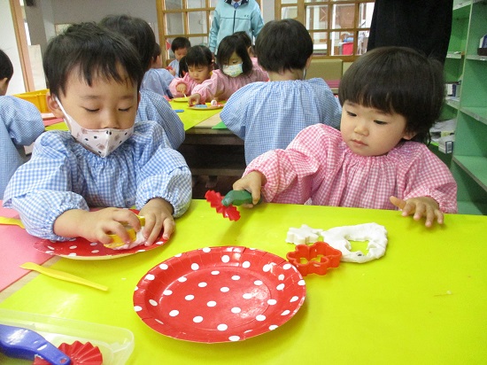 こめこ粘土で、型抜き、だんご、へび、ハンバーガー・・・想像をふくらませて、色々な物を作って楽しんでいます☆