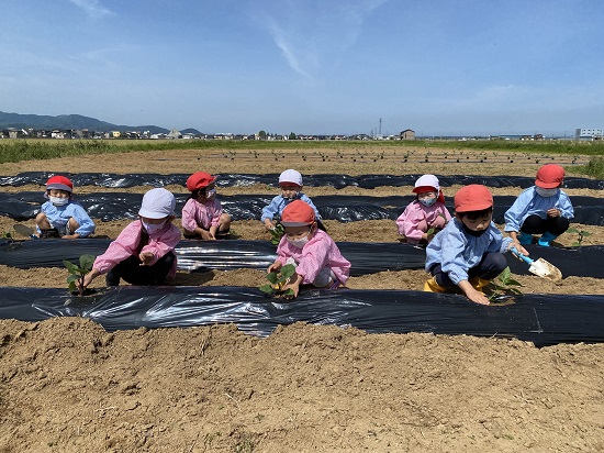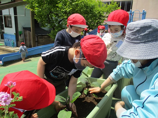 「土がバラバラになっちゃう」「虫がいるー」と言いながらも、上手に植えました。