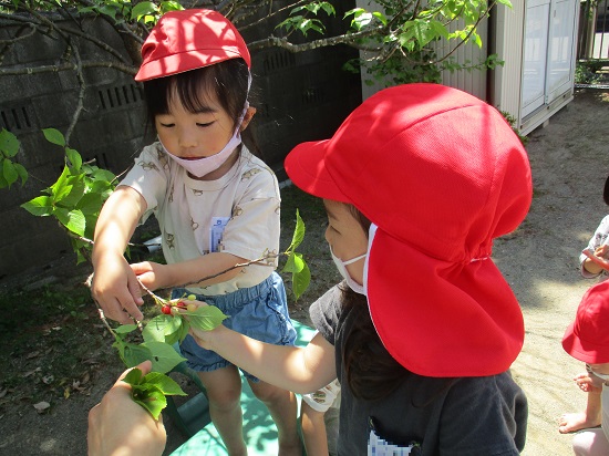 収穫しました。「あまくておいしいね~」とお友達と仲良く食べ、種も上手に出していました^_^