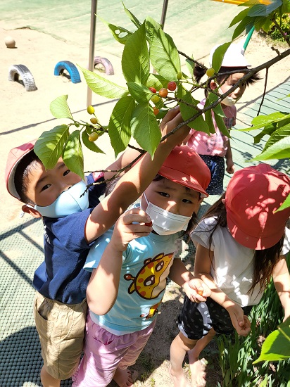 「そーっとそーっと」とつぶさないよう気を付けながらのさくらんぼ狩り。小さい手のひらいっぱいに