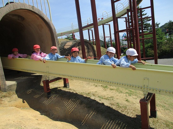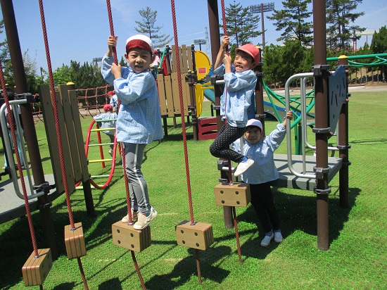 ローラーすべり台等のたくさんの遊具やマラソン、大きなステージで発表ごっこと久しぶりの園外を