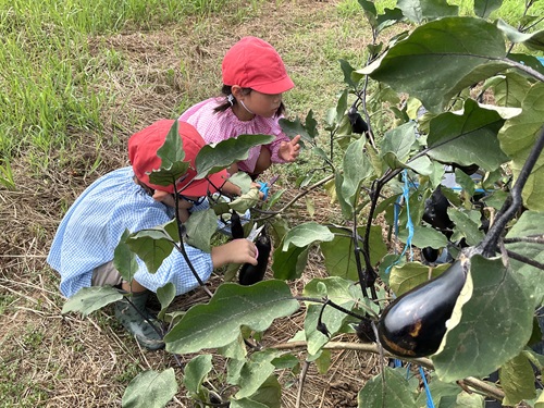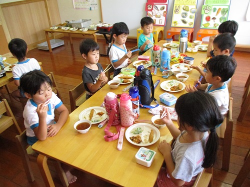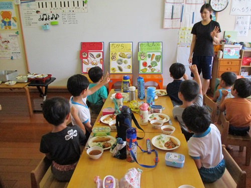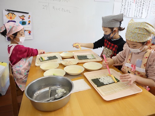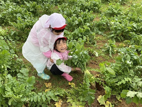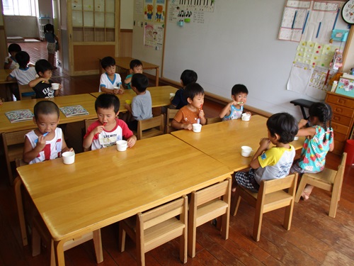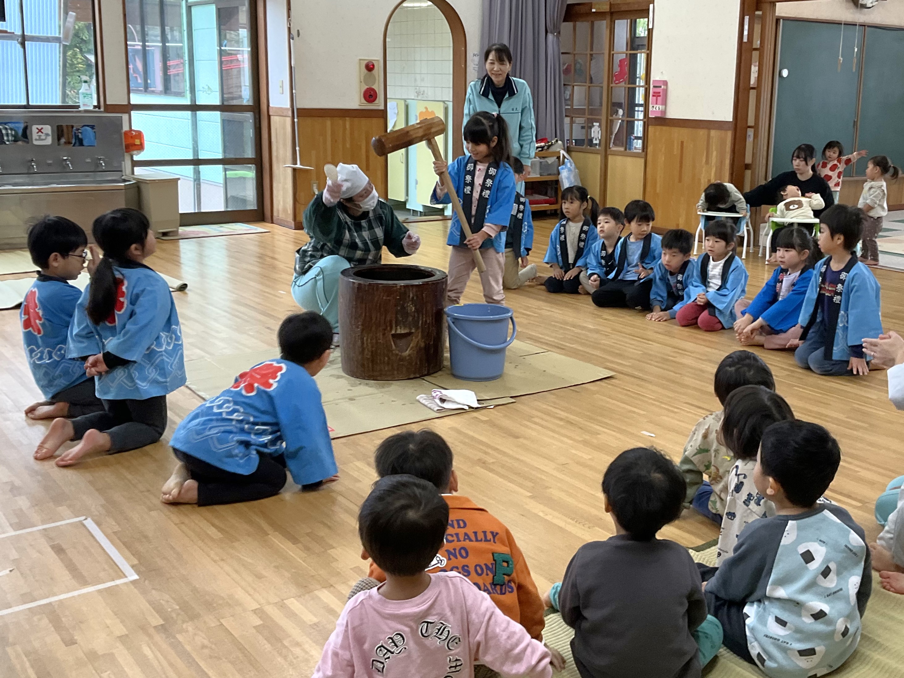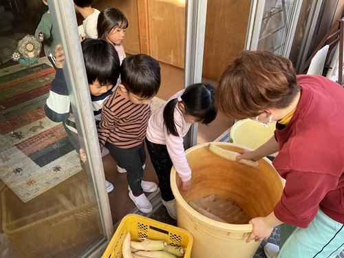 自分で配膳します(3歳児) いちごの収穫 芋ほり 夏野菜の収穫 野菜の水やり(2歳児) 大根引き おいしいたくあんになりますように(5歳児) 三色栄養教室 箸使いも上手になったかな 歯みがき クッキング(3~5歳児) もちつき会